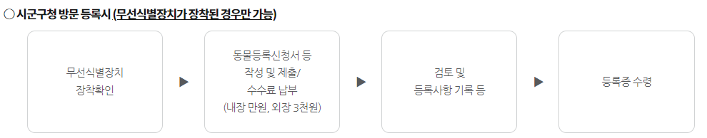 - 최초 등록 시에는 동물등록에게 무선식별장치를 장착하기 위해 반드시 1. 등록 대상동물과 동반하여 2, 방문신청 하셔야 합니다.