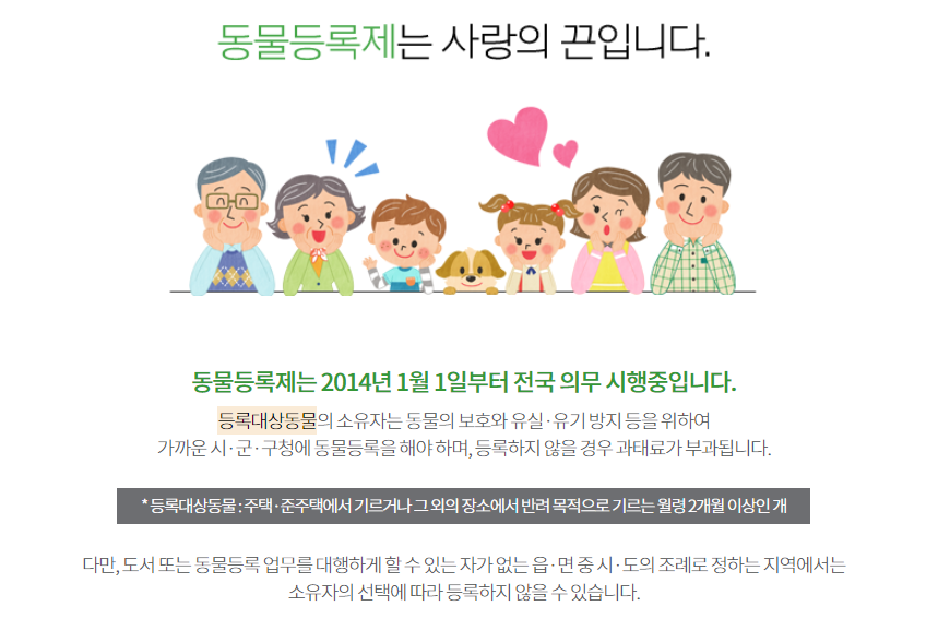 *등록대상동물: 주택·준주택에서 기르거나 그 외의 장소에서 반려 목적으로 기르는 월령 2개월 이상인 개